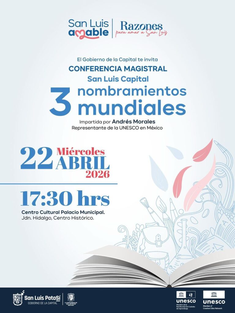 El Ayuntamiento de San Luis Capital invita a la ciudadanía a la conferencia magistral “San Luis Capital: 3 nombramientos mundiales”, que será impartida por Andrés Morales, representante de la UNESCO en México, como parte de las acciones para fortalecer la proyección internacional de la ciudad. El evento se llevará a cabo el miércoles 22 de […]