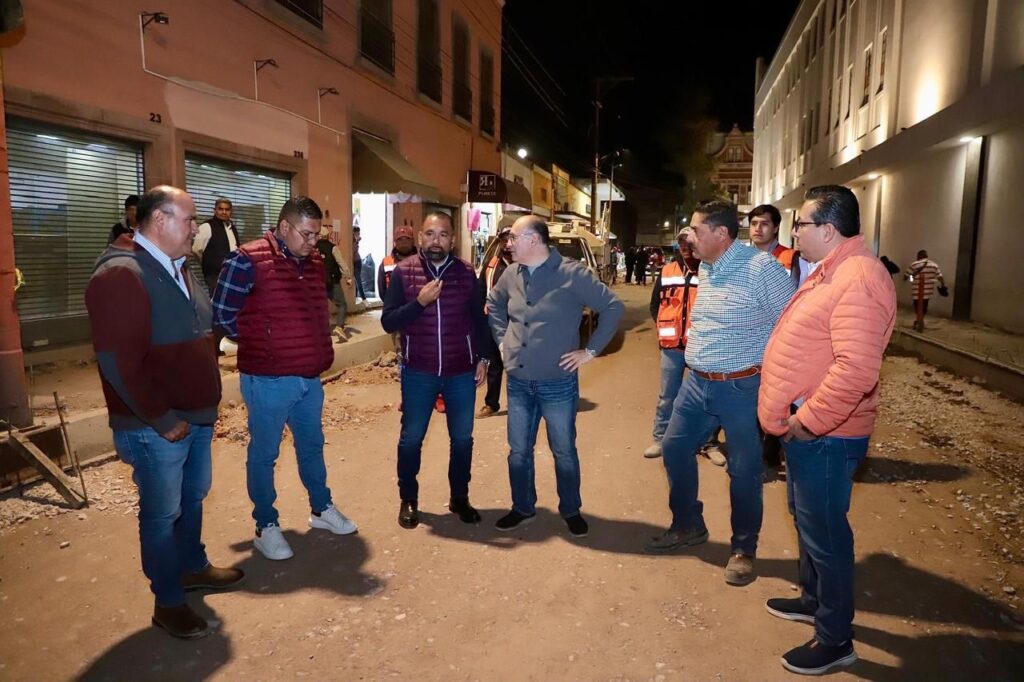 El Alcalde Enrique Galindo Ceballos realizó este jueves una supervisión nocturna de los trabajos de regeneración integral en la calle Julián de los Reyes, en el corazón del Centro Histórico de San Luis Potosí, acompañado del Director de Obras Públicas, Eustorgio Chávez Garza y del Director de Comercio Municipal, Ángel de la Vega Pineda. Durante el recorrido, el Presidente Municipal destacó que esta obra representa una inversión clave para fortalecer el comercio tradicional de la zona, con el compromiso de que esté lista para la temporada decembrina.