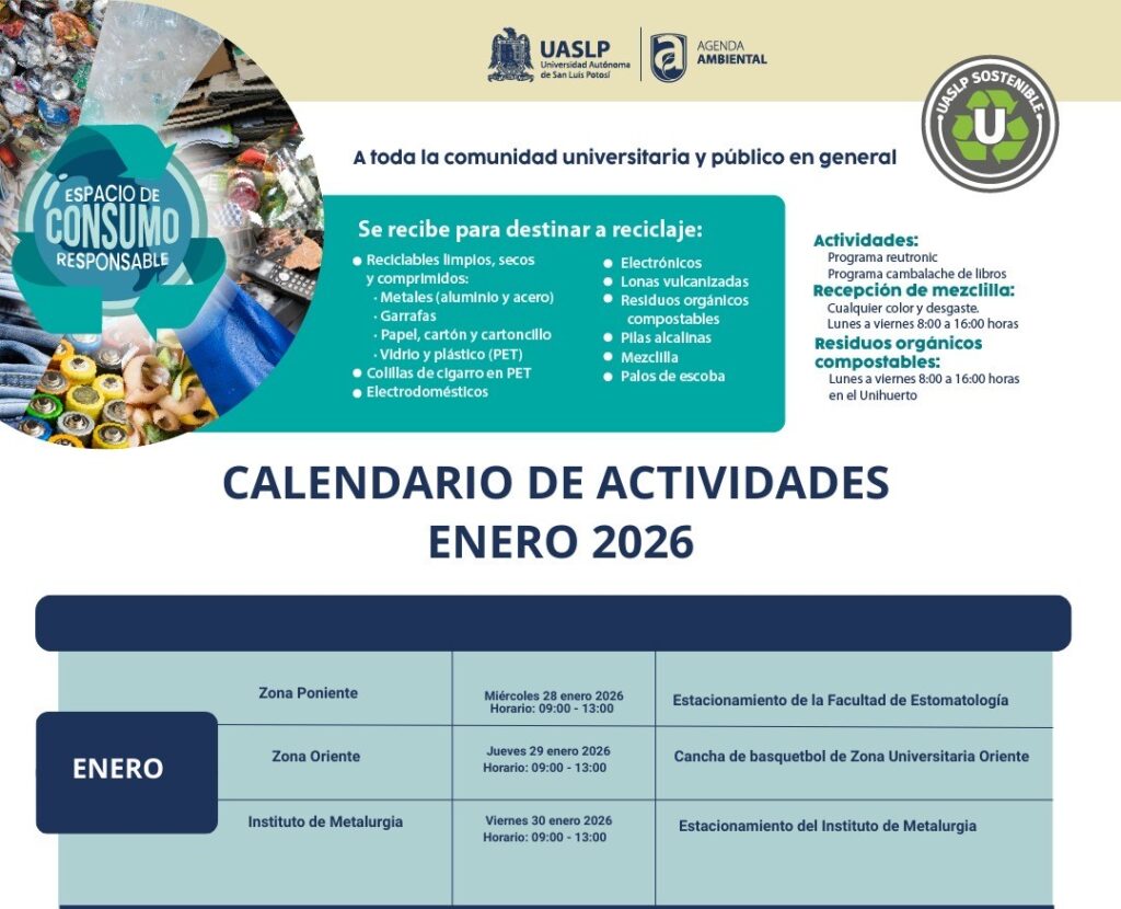 – La jornada recibirá materiales reciclables y de reúso en distintos puntos de la Universidad. San Luis Potosí, S.L.P.- La Agenda Ambiental de la Universidad Autónoma de San Luis Potosí llevará a cabo el primer Programa de Consumo Responsable de 2026 este miércoles 28 de enero, en el estacionamiento de la Facultad de Estomatología, en […]
