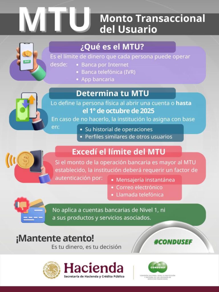 A partir del 1 de octubre entrará en vigor el Monto Transaccional del Usuario (MTU), una medida impulsada por la Comisión Nacional Bancaria y de Valores (CNBV) para reforzar la seguridad en las transferencias electrónicas. Todos los clientes bancarios deberán establecer un límite de operaciones en sus aplicaciones o cuentas, de lo contrario se les […]