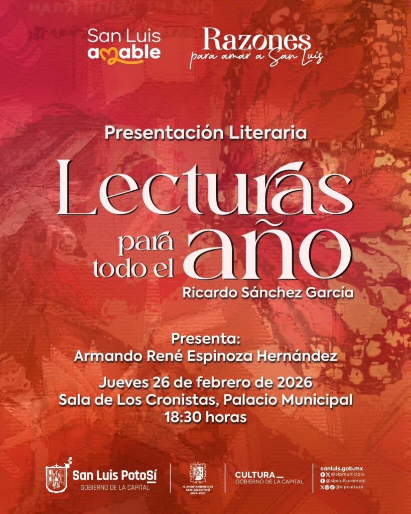 El Gobierno Municipal de San Luis Potosí, encabezado por el alcalde Enrique Galindo Ceballos, a través de la Dirección de Cultura Municipal, invita al público en general a la presentación del libro Lecturas para todo el año, del autor Ricardo Sánchez García, que se realizará el próximo miércoles 26 de febrero, a las 18:30 horas, en la Sala de los Cronistas, como […]