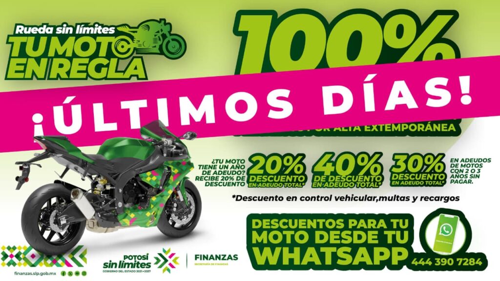 San Luis Potosí, S.L.P.- La Secretaría de Finanzas del Gobierno del Estado informó que el próximo 10 de diciembre concluye el programa “Tu moto en regla, rueda sin límites”, iniciativa que ofrece beneficios especiales para la regularización de motocicletas con adeudos o sin registro previo. La estrategia, impulsada por el Gobernador Ricardo Gallardo Cardona, contempla […]