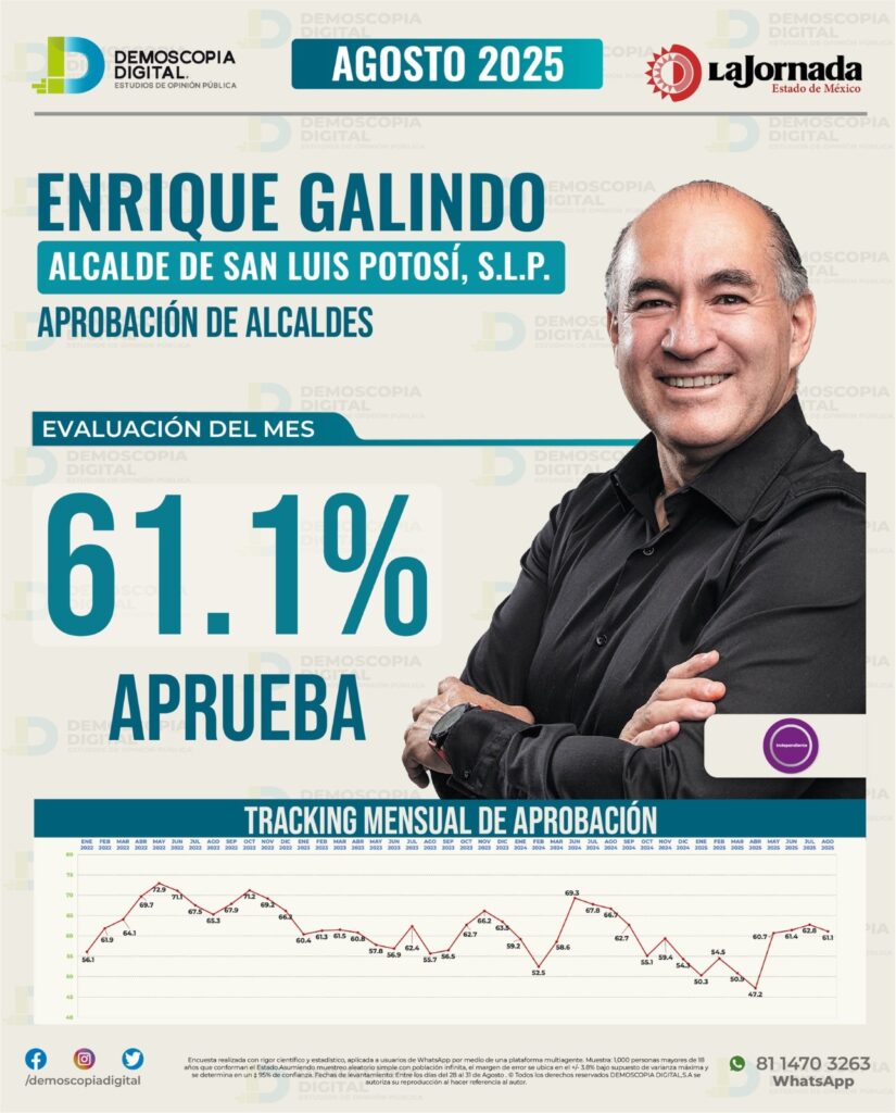 De acuerdo con la evaluación que realiza mensualmente la firma Demoscopia Digital, el Presidente Municipal de San Luis Potosí, Enrique Galindo Ceballos, se ubicó en el primer lugar en la aprobación de alcaldes de la entidad potosina, gracias a la calificación que le dio la ciudadanía, que superó más del 61 por ciento en el […]