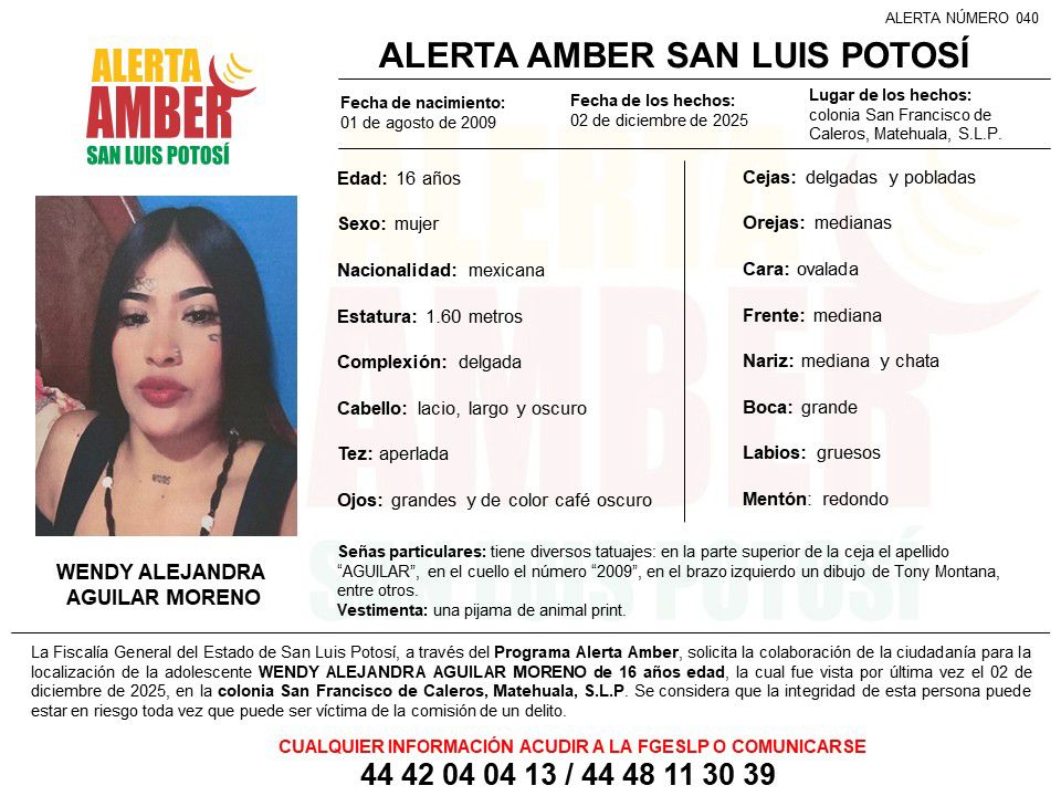Matehuala, S.L.P.- La Fiscalía General del Estado de San Luis Potosí intensificó las acciones de búsqueda para localizar a Wendy Alejandra Aguilar Moreno, adolescente reportada como no localizada desde el pasado 2 de diciembre en la colonia San Francisco de Caleros, en la Zona Altiplano. Ante la situación, se activó una ficha de Alerta Amber, […]