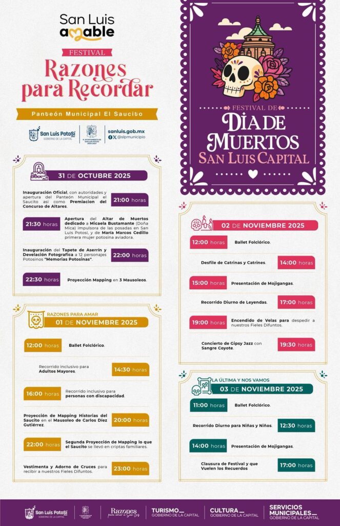 La inauguración oficial del Festival Razones para Recordar será con la apertura del panteón El Saucito y la premiación del concurso de altares el próximo viernes a partir de las 9 de la noche; para posteriormente abrir el altar de Muertos dedicado a Micaela Bustamante impulsora de las posadas en la ciudad y en honor a la primera potosina aviadora, María Marcos Cedillo; después se inaugurará el tapete de aserrín y develación fotográfica de 12 personajes de San Luis y esa noche se concluirá con la proyección mapping en Mausoleos del citado cementerio.