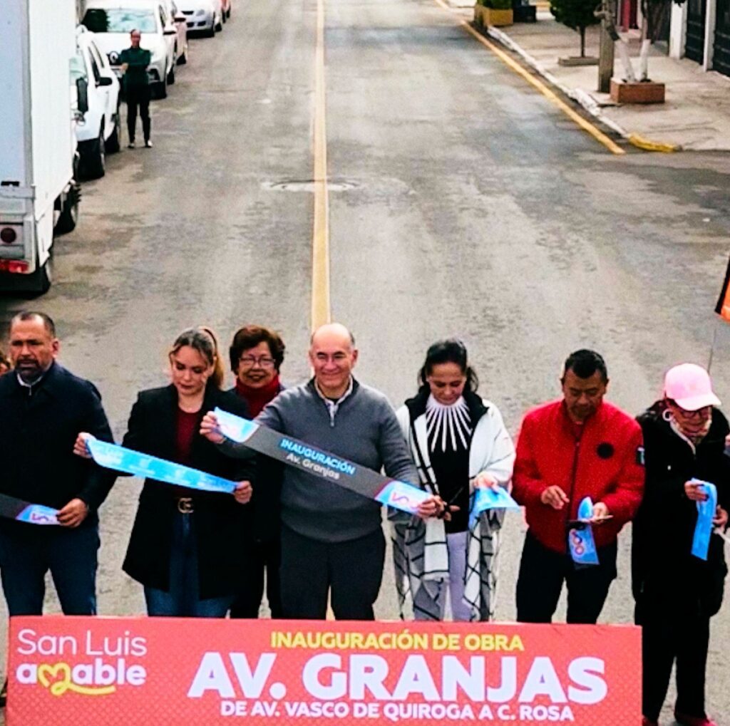 El Alcalde de San Luis Capital, Enrique Galindo Ceballos, inauguró la rehabilitación integral de la avenida Granjas, que conecta Vasco de Quiroga y avenida  Morales-Saucito, una de las vialidades más extensas e importantes de la colonia Industrial Aviación. Se trata de una obra que por décadas fue demandada por vecinas y vecinos de la zona, a quienes dio otra noticia: pavimentará otra calle más: Fray J. de Juárez, que presenta un evidente deterioro.