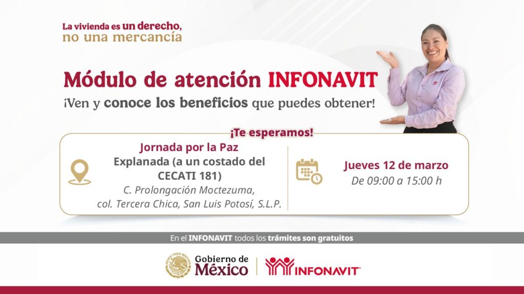 San Luis Potosí, S.L.P.- Con el propósito de acercar sus servicios a las y los trabajadores, el INFONAVIT instalará módulos de atención en Ciudad Valles y en la capital del estado el jueves 12 de marzo, en un horario de 09:00 a 15:00 horas. En estos espacios se brindará asesoría personalizada para quienes buscan adquirir un crédito o requieren apoyo para regularizar su financiamiento.