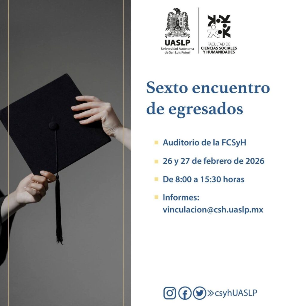 San Luis Potosí, S.L.P.- La Facultad de Ciencias Sociales y Humanidades de la Universidad Autónoma de San Luis Potosí invita a participar en el Sexto Encuentro de Egresados, que se llevará a cabo los días 26 y 27 de febrero en el auditorio del plantel, de 8:00 a 15:30 horas. El evento reunirá a egresadas y egresados de diversas generaciones con el propósito de intercambiar experiencias profesionales y dialogar sobre los retos actuales del ejercicio laboral y académico.