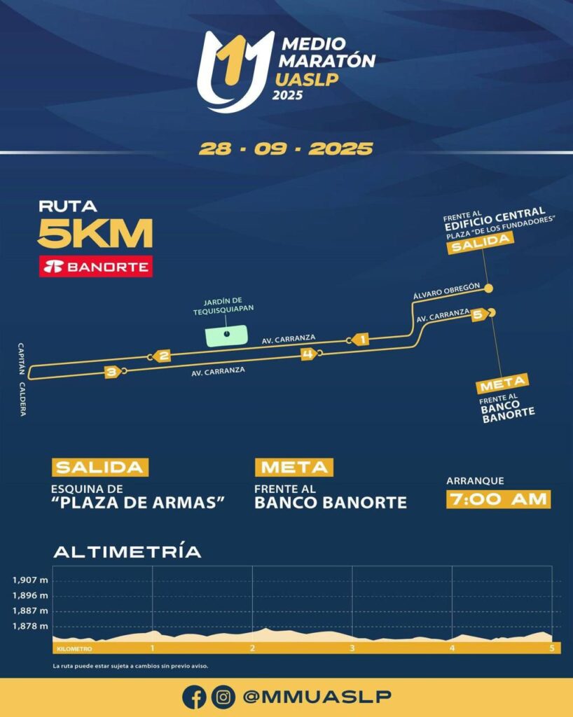 De acuerdo con el plan operativo para esta justa deportiva, la ruta para el recorrido de los 5 kilómetros será: como punto de salida Álvaro Obregón, continuarán hacia Venustiano Carranza, a la altura de Capitán Caldera retornarán por la misma avenida de Carranza con meta en Plaza Fundadores frente a la institución bancaria Banorte.