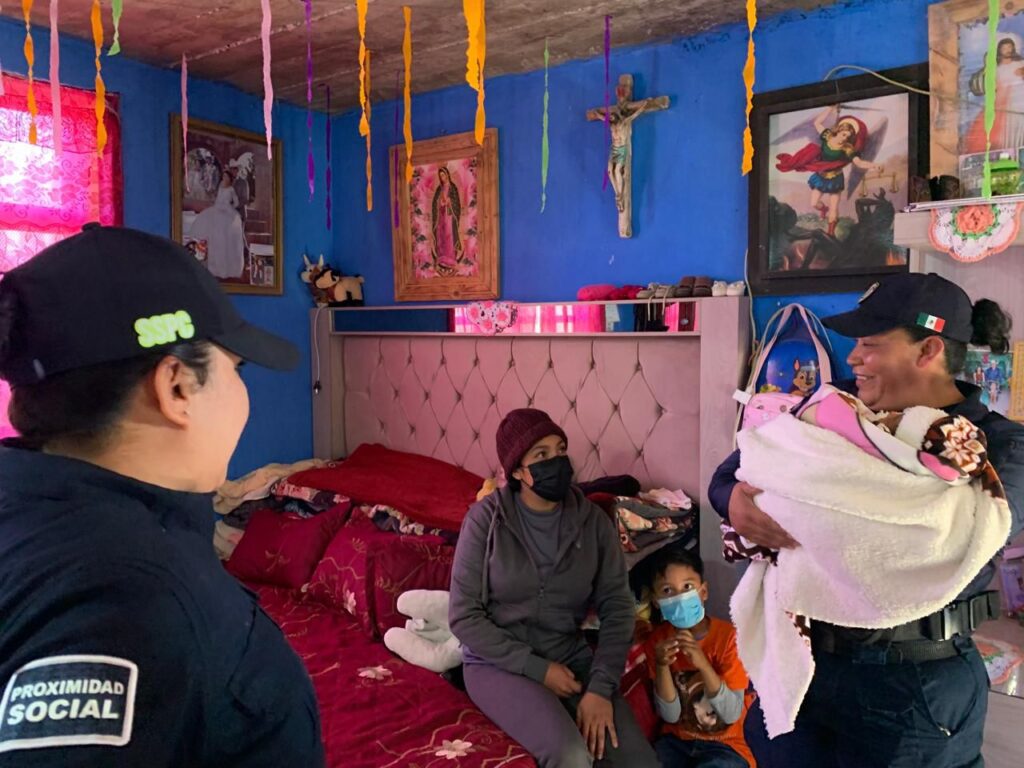 Como muestra de acompañamiento y cercanía, los elementos municipales entregaron artículos de primera necesidad, ropa, cobijas y despensa, además de constatar el buen estado de salud de la bebé.