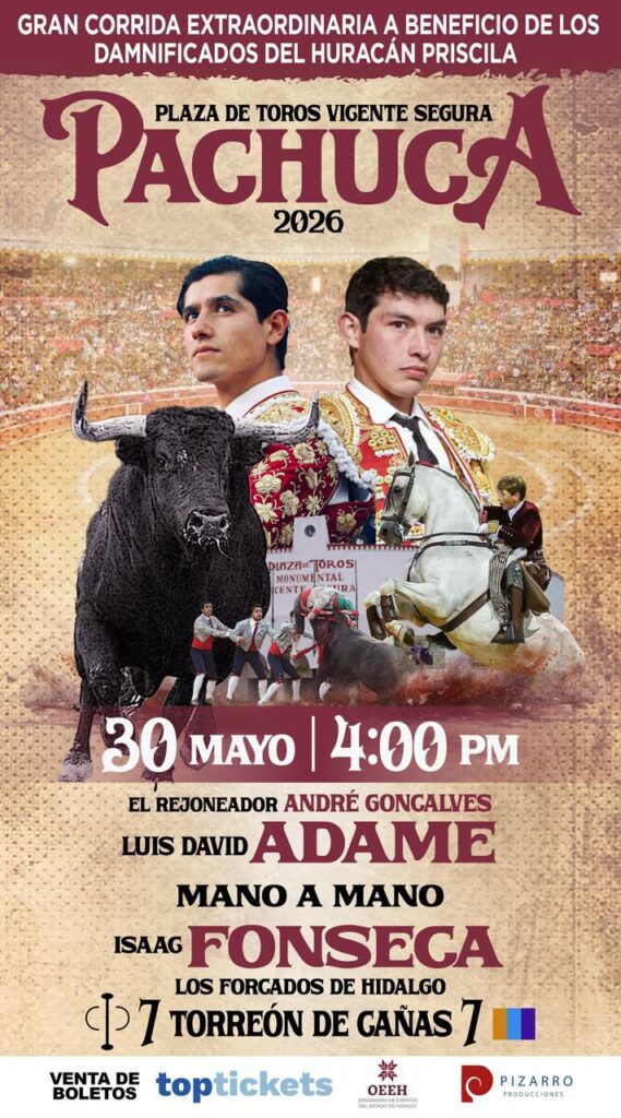 Pachuca, Hidalgo.- En la Plaza de Toros Vicente Segura se presentó el cartel de la corrida con causa que se celebrará el próximo 30 de mayo a las 16:00 horas, en apoyo a las comunidades hidalguenses afectadas por las inundaciones provocadas por la vaguada monzónica. El festejo reunirá al rejoneador André, a los matadores Luis David e Isaac Fonseca, así como a los Forcados de Hidalgo, quienes lidiarán un encierro de Torreón de Cañas.