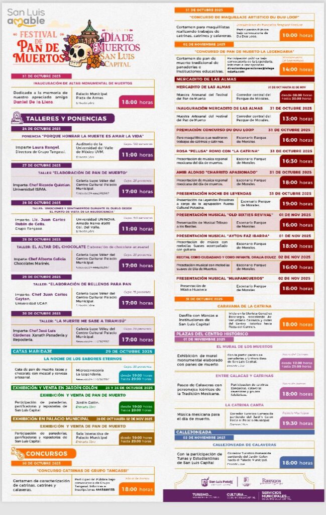 29 de octubre: Cata “La Noche de los Sabores Eternos” con pan de muerto, tapas, chocolate, mezcal y cerveza artesanal en La Legendaria. 30 de octubre: Taller “La muerte me sabe a tiramisú” con el Chef José Luis Cárdenas, y el concurso Catrinas de Grupo Tangassi, con registro previo al (444)188 01 55 en plaza de Armas. 31 de octubre: Inauguración del Altar Monumental de Muertos en Palacio Municipal; Mercadito de las Almas en el parque Morales; presentaciones de Rosa “Pelusa” Romo, Amir Alonso “Charrito Apasionado” y el grupo Old Sixties Revival; premiación del concurso de maquillaje artístico Du Duu Loop y la Caravana de la Catrina.