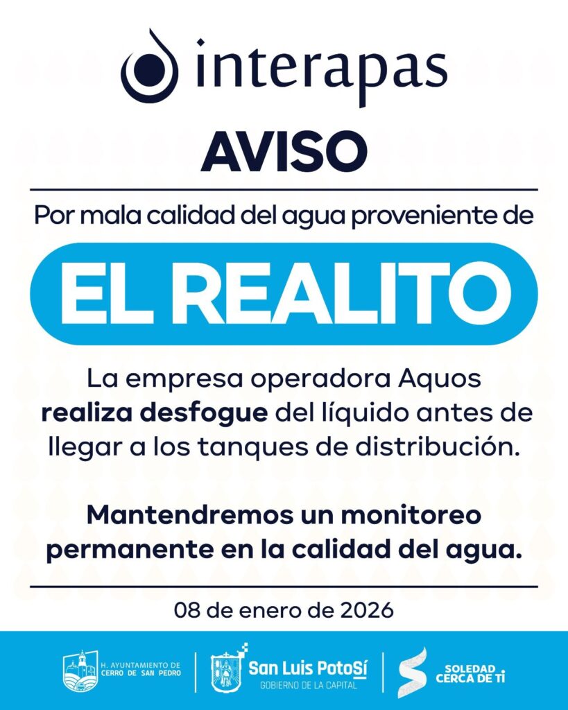 San Luis Potosí, S.L.P.- Luego de identificarse agua fuera de los parámetros establecidos por la normativa para consumo humano, la empresa Aquos, operadora del sistema “El Realito”, informó que detendrá temporalmente el envío de agua y realizará desfogues intermitentes en la línea de conducción para evitar que el líquido llegue a la red de distribución. […]