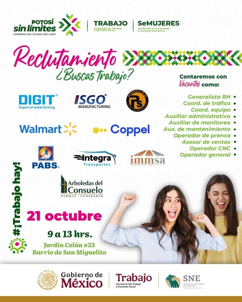 San Luis Potosí, S.L.P.- Con el objetivo de reducir la brecha de género en el empleo formal y fortalecer el empoderamiento económico de las mujeres, el Gobierno del Estado llevará a cabo la sexta Jornada de Reclutamiento Laboral este martes 21 de octubre, de 9:00 a 13:00 horas, en las instalaciones ubicadas en Jardín Colón […]